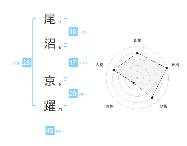 尾沼 京躍さんの総格は45画の4点