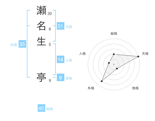 瀬名生 亭さんの総格は40画の2点!