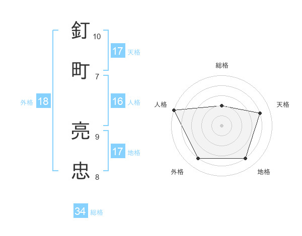 釘町 亮忠さんの総格は34画の2点!