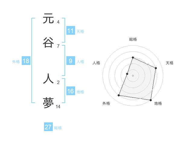 元谷 人夢さんを姓名の画数から五運を鑑定
