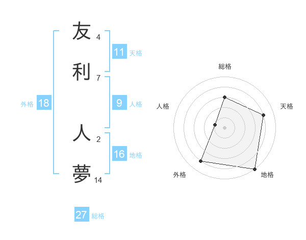友利 人夢さんの総格は27画の3点!