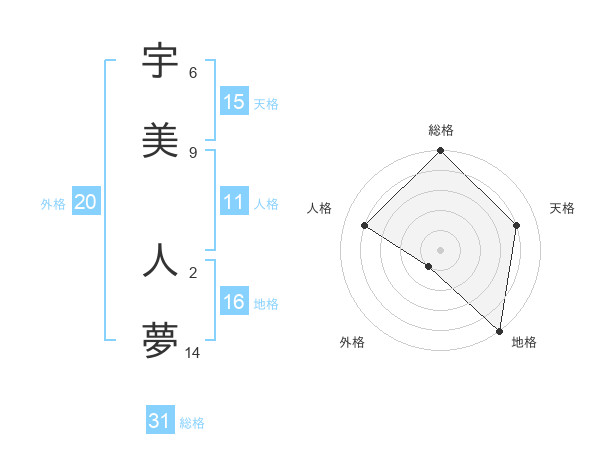 宇美 人夢さんの総格は31画の5点!