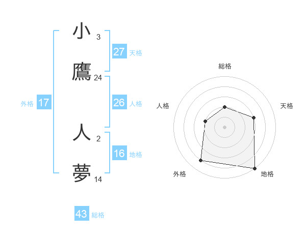 小鷹 人夢さんの総格は43画の2点!