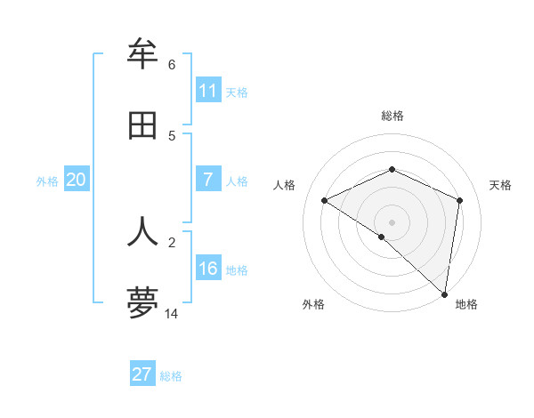 牟田 人夢さんの総格は27画の3点!