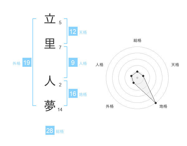 立里 人夢さんの地格は16画の5点!