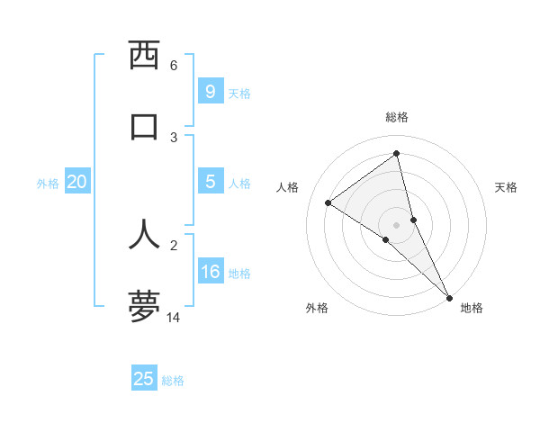 西口 人夢さんの総格は25画の4点!