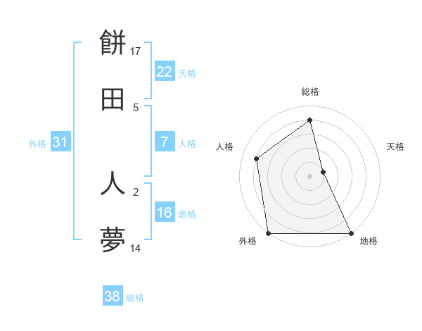 餅田 人夢さんの総格は38画の4点!