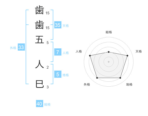 歯歯五 人巳さんの天格は35画の4点!