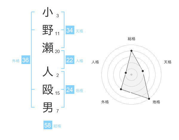 小野瀬 人殴男さんを姓名の画数から五運を鑑定