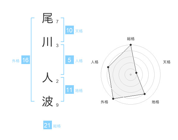 尾川 人波さんの総格は21画の5点!