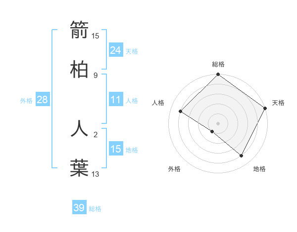 箭柏 人葉さんの総格は39画の5点!