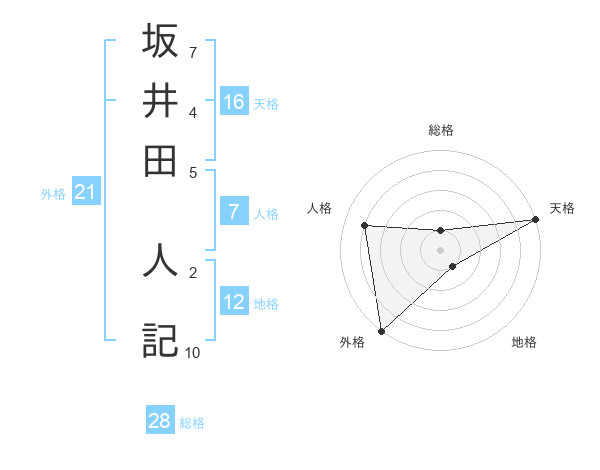 坂井田 人記さんの総格は28画の1点!