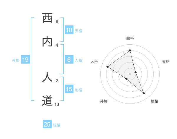 西内 人道さんの総格は25画の4点!