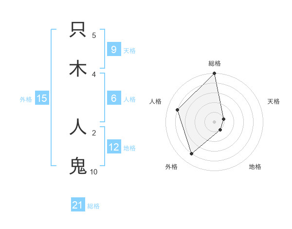 只木 人鬼さんの総格は21画の5点!