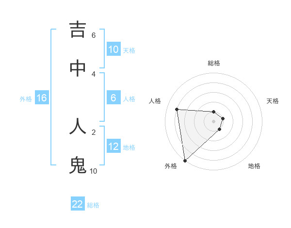 吉中 人鬼さんの総格は22画の1点!