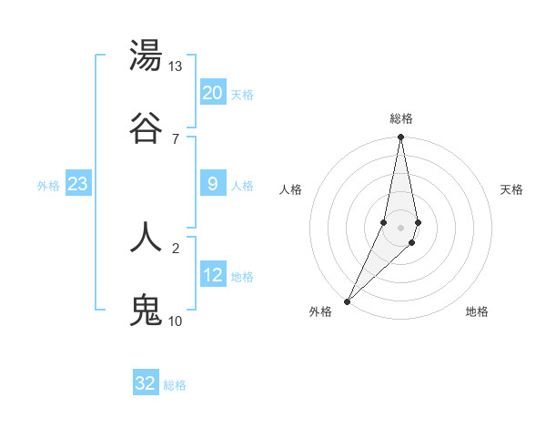 湯谷 人鬼さんを姓名の画数から五運を鑑定