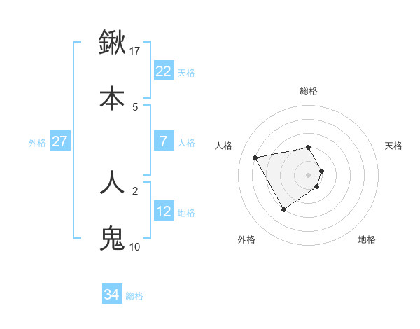 鍬本 人鬼さんの総格は34画の2点!