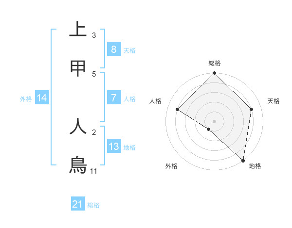 上甲 人鳥さんの総格は21画の5点!