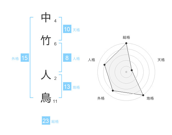 中竹 人鳥さんの総格は23画の5点!