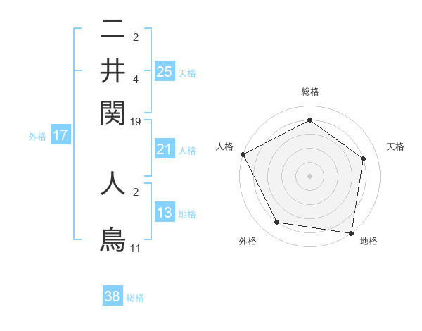 二井関 人鳥さんの総格は38画の4点!