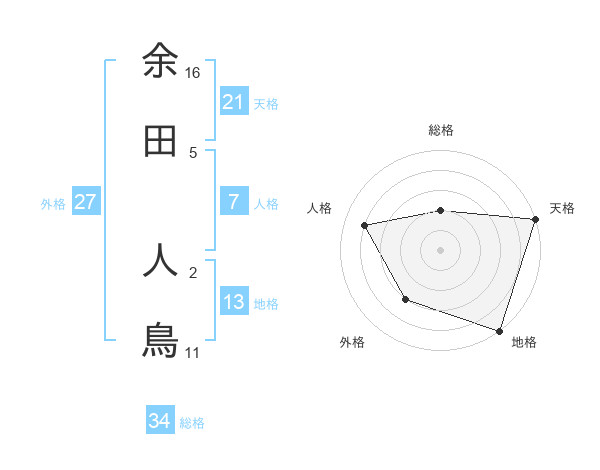 余田 人鳥さんの総格は34画の2点!