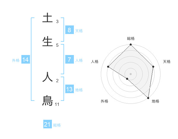 土生 人鳥さんの総格は21画の5点!