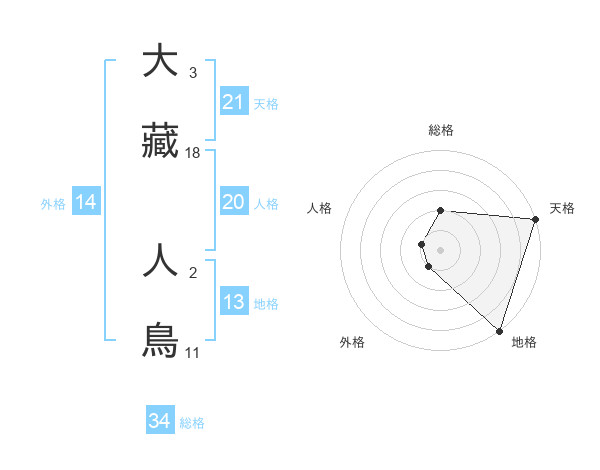 大藏 人鳥さんの天格は21画の5点!