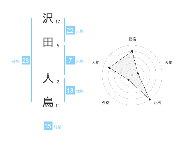 沢田 人鳥さんの総格は35画の4点!