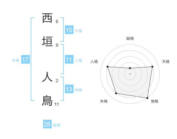 西垣 人鳥さんを姓名の画数から五運を鑑定