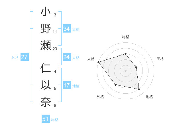 小野瀬 仁以奈さんを姓名の画数から五運を鑑定