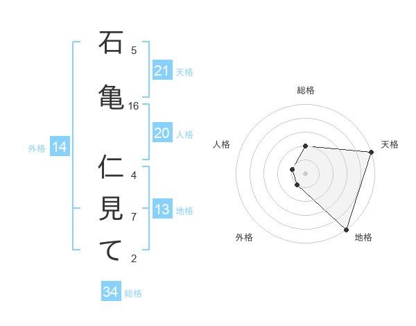 石亀 仁見てさんの天格は21画の5点!