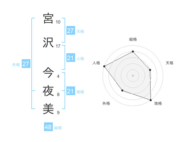 宮沢 今夜美さんを姓名の画数から五運を鑑定