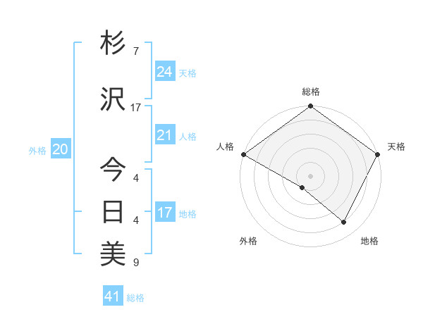 杉沢 今日美さんを姓名の画数から五運を鑑定