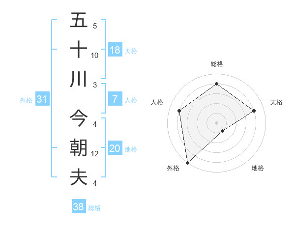五十川 今朝夫さんを姓名の画数から五運を鑑定