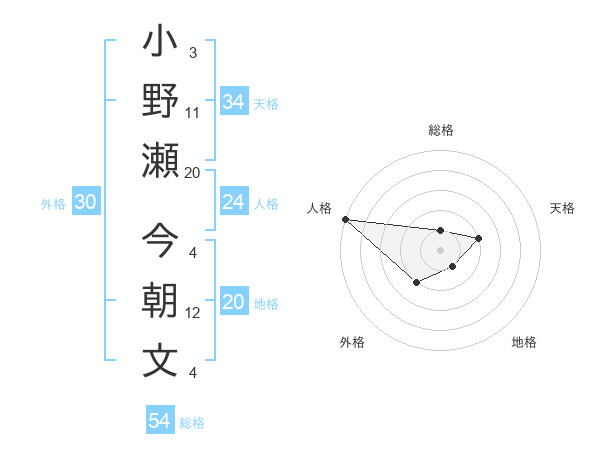 小野瀬 今朝文さんの総格は54画の1点!