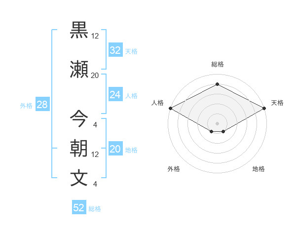 黒瀬 今朝文さんの総格は52画の4点!