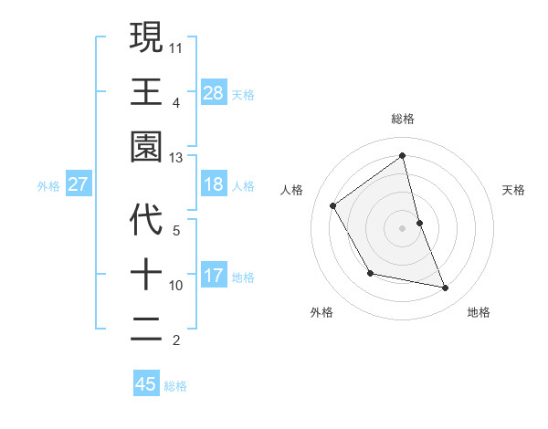 現王園 代十二さんの総格は45画の4点!