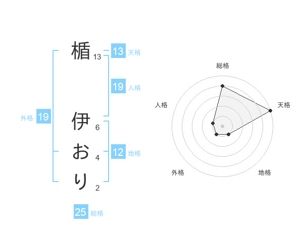 楯 伊おりさんの天格は13画の5点!