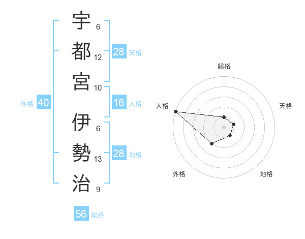 宇都宮 伊勢治さんを姓名の画数から五運を鑑定
