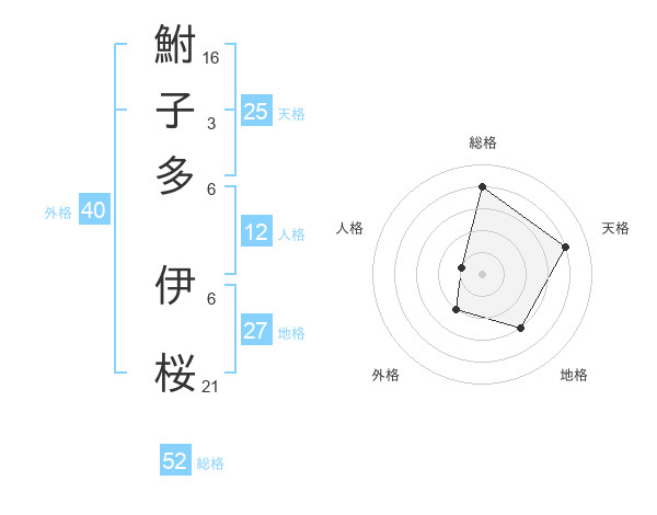 鮒子多 伊桜さんの総格は52画の4点!