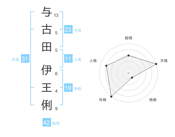 与古田 伊王俐さんを姓名の画数から五運を鑑定