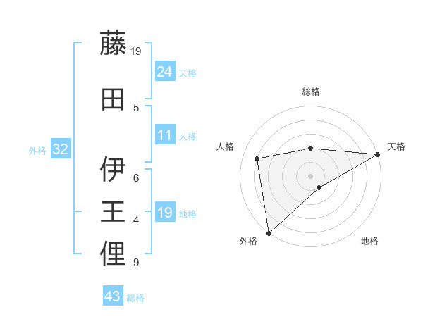 藤田 伊王俚さんの総格は43画の2点!