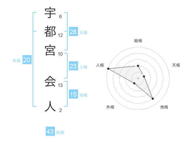 宇都宮 会人さんの総格は43画の2点!