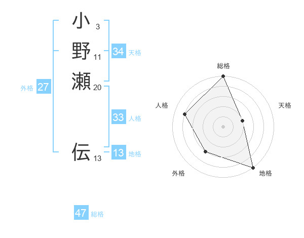 小野瀬 伝さんを姓名の画数から五運を鑑定