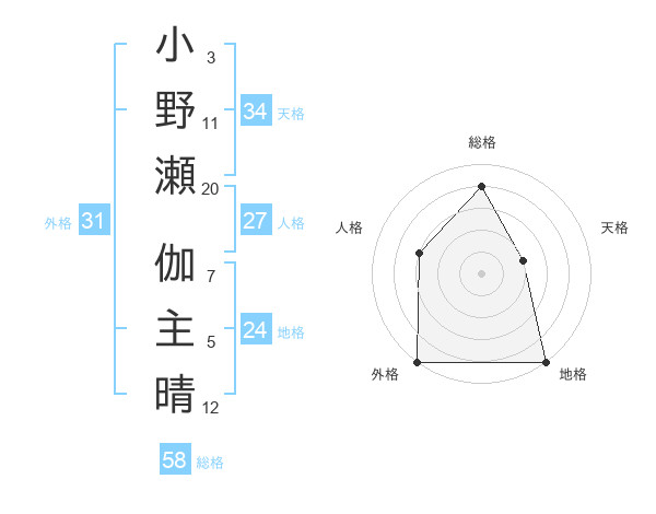 小野瀬 伽主晴さんの総格は58画の4点
