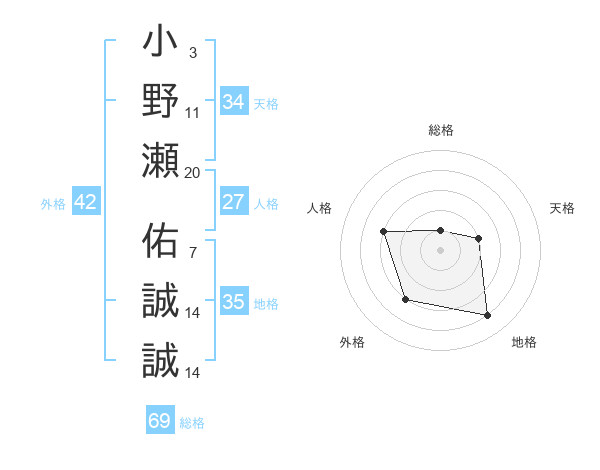 小野瀬 佑誠誠さんの総格は69画の1点!