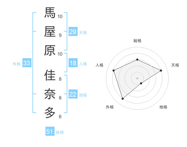 馬屋原 佳奈多さんの総格は51画の3点!