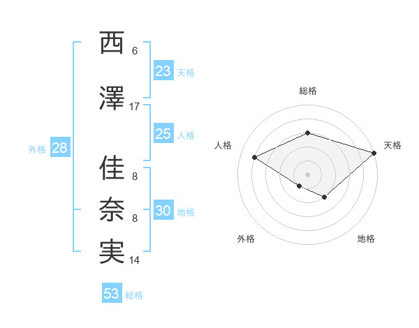 西澤 佳奈実さんの総格は53画の3点!