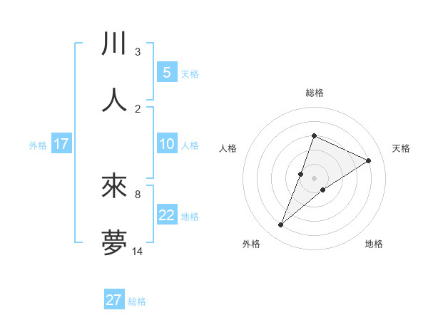 川人 來夢さんを姓名の画数から五運を鑑定
