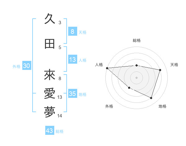 久田 來愛夢さんを姓名の画数から五運を鑑定